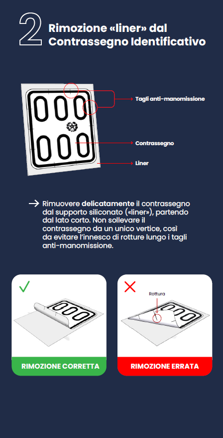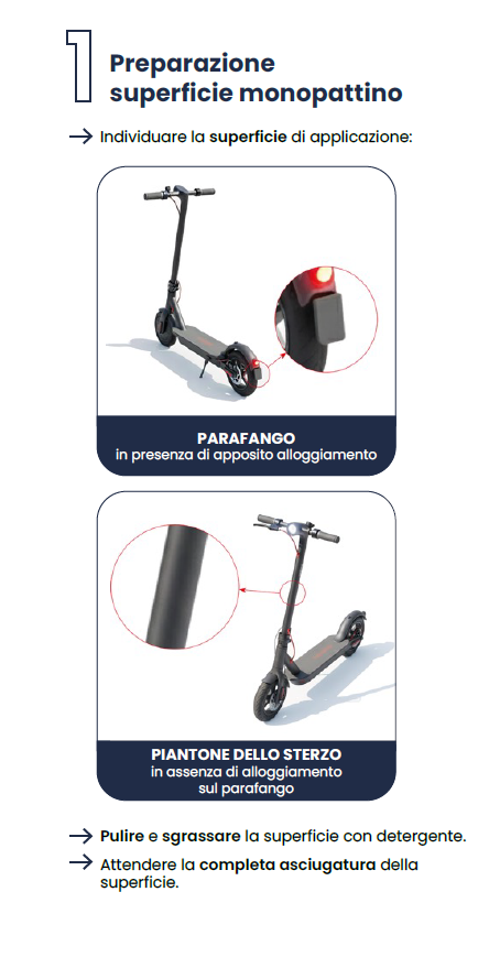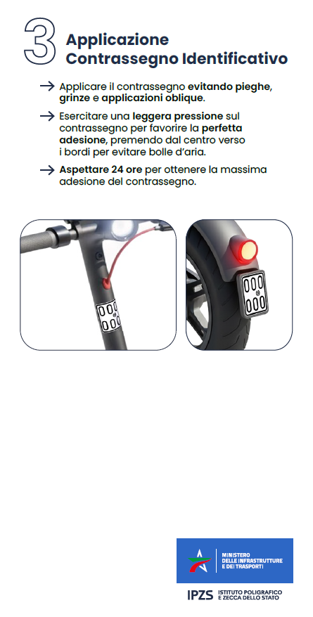 Il Contrassegno Identificativo del monopattino deve essere applicato su una superficie pulita e asciutta.